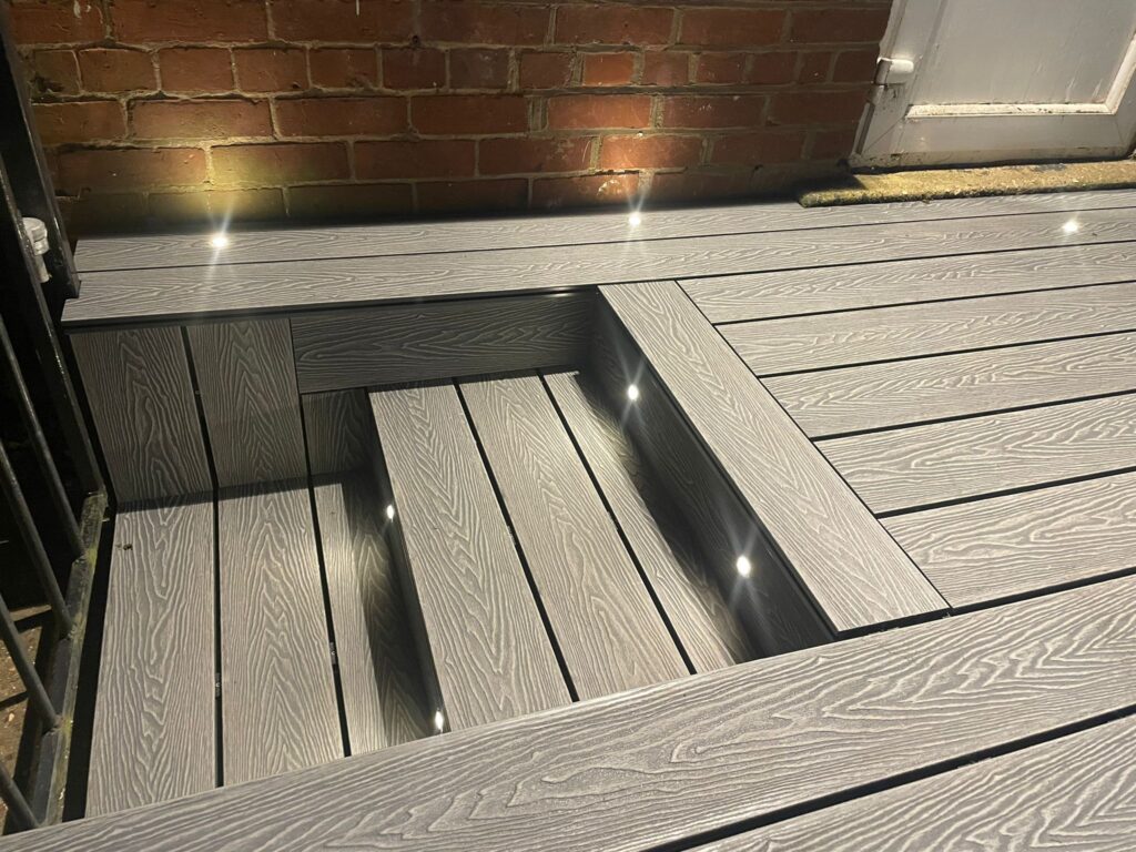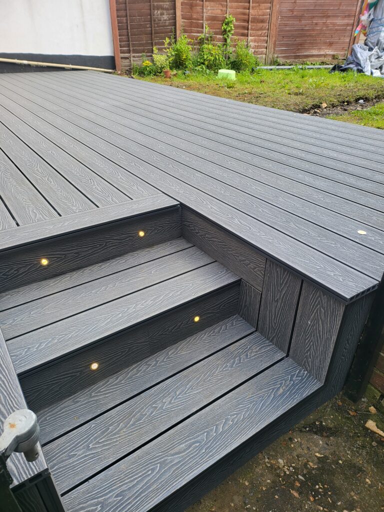 To enhance both the safety and aesthetic appeal of the kitchen’s exterior, a substantial improvement has been made by constructing a decking frame that extends up to the back door level. This strategic renovation effectively removes the previous hazard posed by the steep concrete steps that originally led out from the kitchen.
